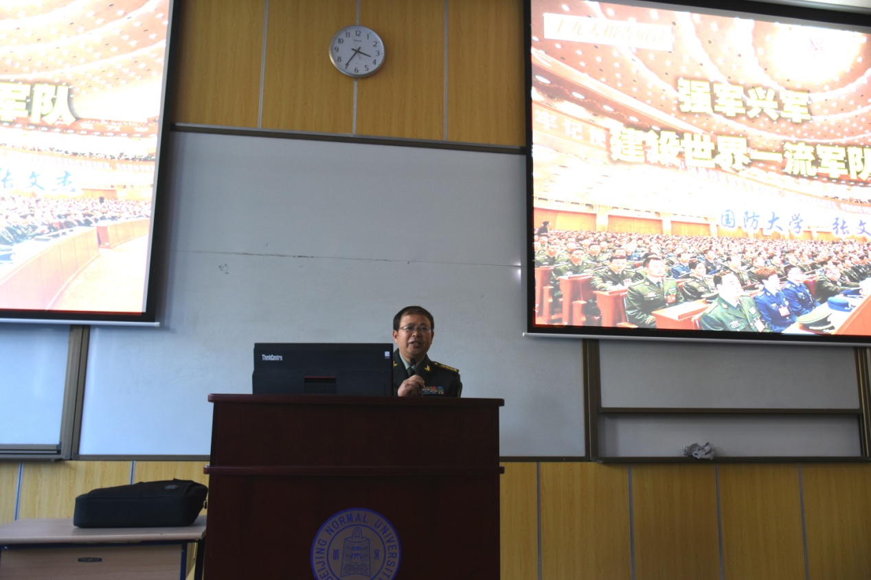 张文杰教授从五年来强军兴军的历史成就引入话题,详细介绍了党的十八大以来国防和军队建设取得的成就,并结合十九大报告中对于国防和军队建设的内容作了细致解读。他指出五年来强军兴军的历史成就可以用三个词语来概括:立根固本、全面重塑、备战打仗。习近平总书记在领导强军兴军的伟大事业中,坚持和发展党的军事指导理论,不断开拓马克思主义军事理论和当代中国军事实践发展新境界,形成了新时代党的强军思想。他强调,实现党在新时代的强军目标、建设世界一流军队,必须按照习近平总书记擘画的强军布局推进强军事业,全面提高国防和军队现代化水平,为决胜全面建成小康社会、实现中华民族伟大复兴的中国梦提供坚强力量保证。最后他表示,我们的军队是人民军队,我们的国防是全民国防。我们还要加强全民国防教育,巩固军政军民团结,为实现中国梦强军梦凝聚强大力量。
