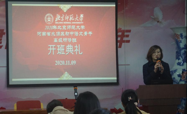 以及发展合作中心提供的学习平台与机会表达了真诚的谢意。她在讲话中谈到,大家一定会认真聆听国宝级大师的讲座,感受最深厚最纯正的文学,学习最科学的教育理念。骨干教师承担着重要的教育责任,对于处于教育发展高原期的他们来说,研修学习有助于助力他们实现自我超越,快速发展。她期待本次骨干研修班能够促进他们思考如何从思想理念、学习方法、教育教学方法等诸方面完成从教书匠到教学名师的蜕变,从而发挥辐射作用,促进河南省整体教育质量的提升。贺茜老师郑重承诺,参训老师们一定会珍惜研修机会,积极参与、用心研讨,通过研修开阔视野,提升语文教育能力,成为优秀的教育工作者。最后,她还提到了要按照北京市要求做好防疫措施,在快乐高效学习的同时也要确保自身安全。