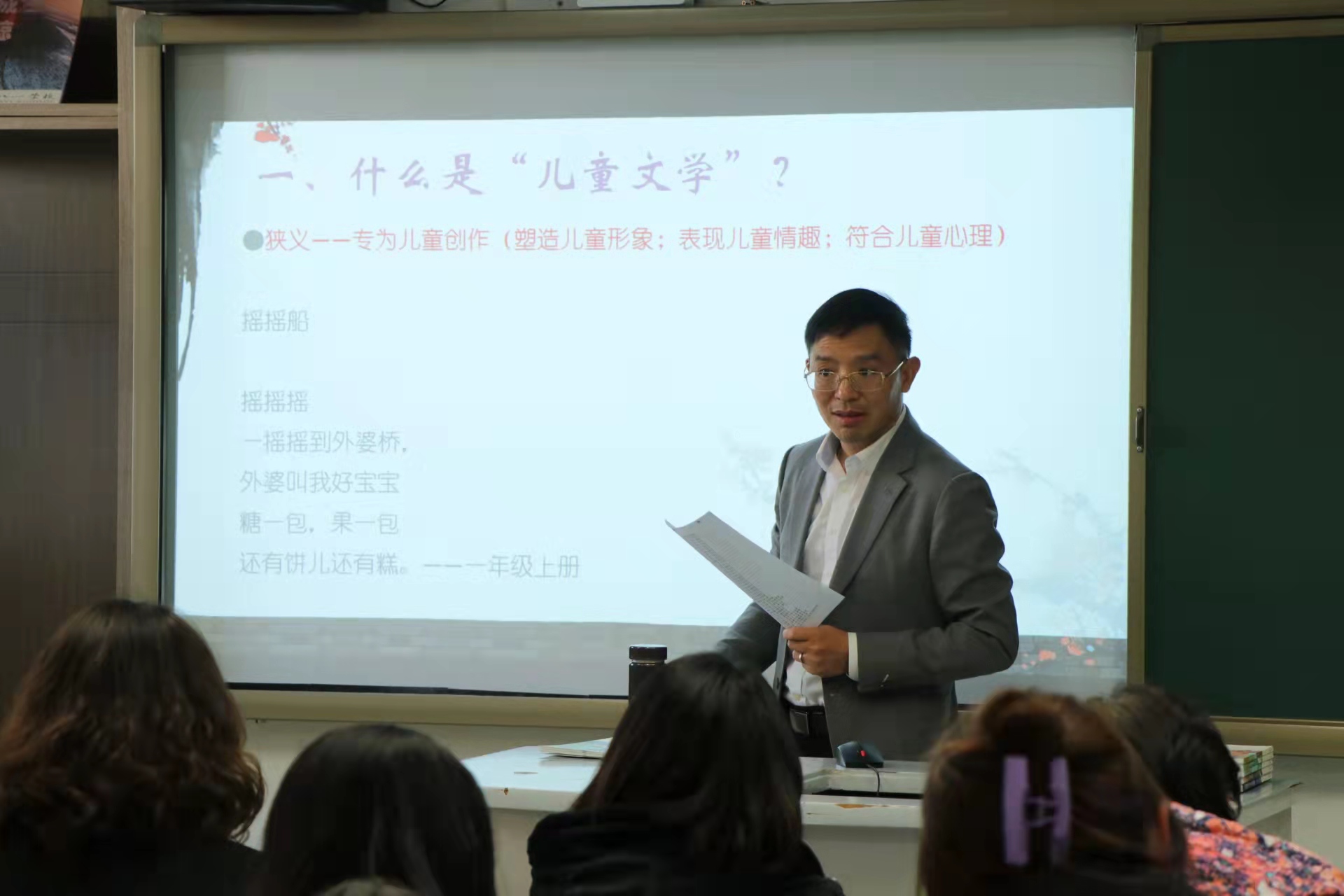 开班典礼圆满结束后,张国龙教授为八一学校的老师们带来题为《部编版小学语文教材中的儿童文学——兼谈“童话”与“儿童诗”教学》的讲座。张教授由什么是儿童文学谈起,介绍了部编版小学语文教材中儿童文学的编排与选择,并通过具体篇目带领老师们“回到原点”看“儿童诗”与“童话”。