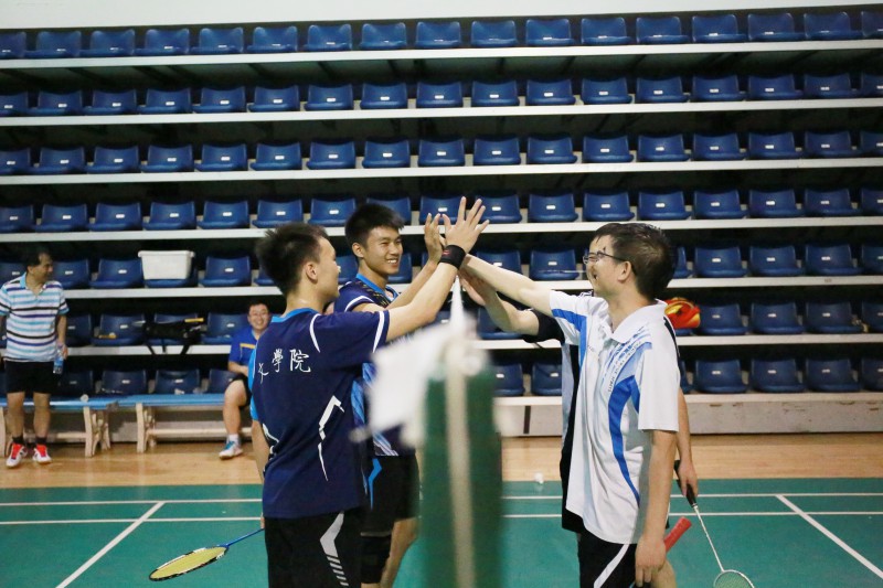 全场比赛气氛轻松活跃,本着“友谊第一,比赛第二”的精神进行了男双、混双以及单打的比赛,九号场地上,本科生成航、邓鹏程、张淇源临时配对与赖彦斌等老师展开双打“车轮战”,双方攻守转换迅速,既有大力扣杀的激情,有网前互搓小球的细腻,也有连续挽救赛点的紧张。最后一小时,邓鹏程和成航组成文院最强双打阵容应战,与老师连战4局,互有胜负,老师连连发出了“年轻人就是有活力”的赞叹,本科生也不由感慨老师手法的老辣与娴熟。