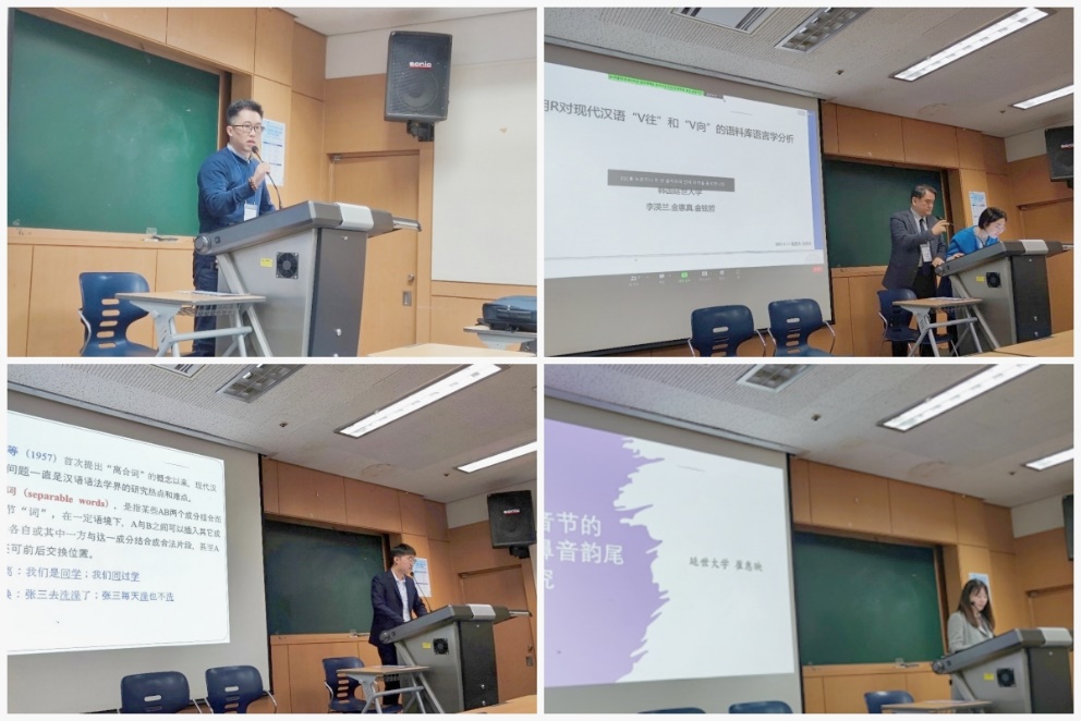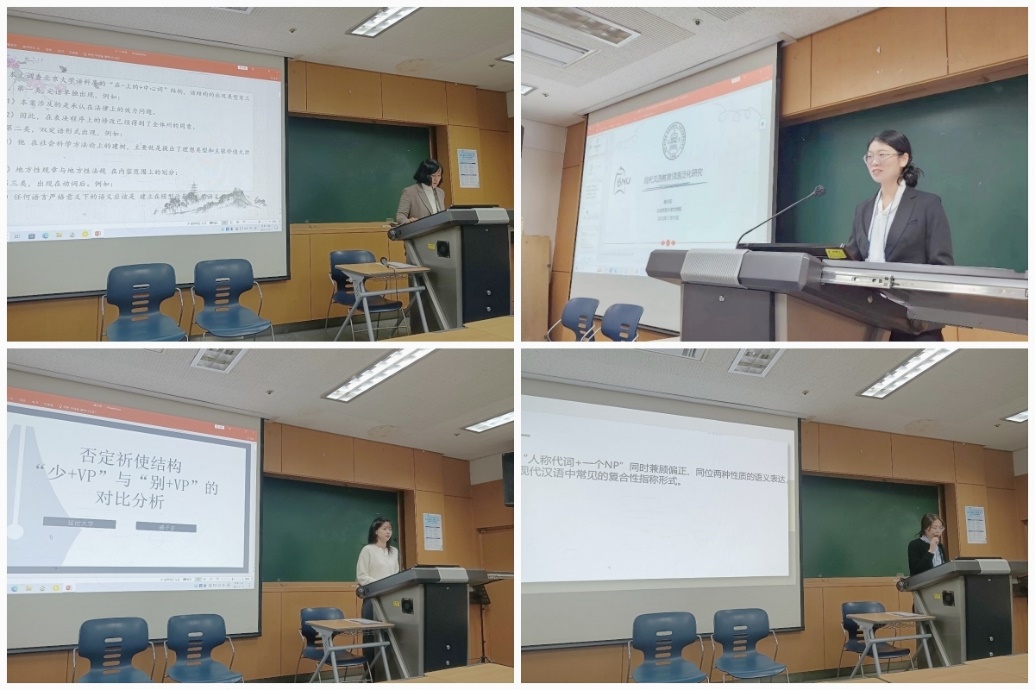 第二节中,延世大学博士生权书妍的报告《“在-上”框架作定语考察》,通过统计“在-上”框架的使用类型,指出“在-上的+中心词”结构中的“在”与一般介词短语中的“在”不同。北师大博士生韩冬阳的报告《现代汉语教育词语泛化研究》,对现代汉语教育词语的泛化方式进行了定量统计,并分析了泛化的特点和动因,为辞书编纂提供相关建议。延世大学博士生盛子芸的报告《否定祈使结构“少+X”与“别+X”的对比分析》,探讨了现代汉语中否定祈使结构“少+X”和“别+X”在语义和组配方面的互换性与差异性。延世大学博士生杨亮丽的报告《同位复指构式“人称代词+一个NP”的主观性表达》,基于认知语言学的“主观性”和“主观化”理论考察同位复指构式“人称代词+一个NP”的主观性表达,分析了该结构的主观性类型、主观化途径及语用功能。