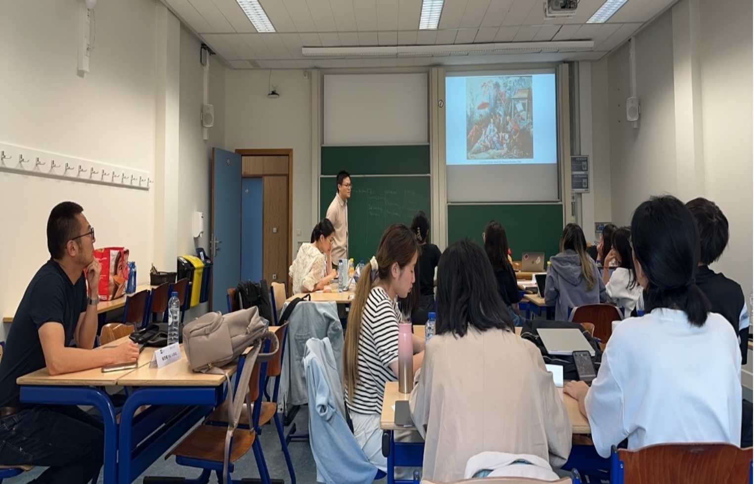 国际课程班采取分组研讨与合作的形式进行交流。同学们以小组为单位,围坐在一起,进行自我介绍和实时互动。最终的课程成果展示方式也采取了小组合作完成并汇报的形式。同学们彼此之间的距离逐渐拉近,本硕博的学制壁垒也被打破,加深了彼此之间的了解,提升了集体协作的意愿和能力。在最后的小组成果展示环节,各组分别围绕中欧音乐艺术节的比较、东西方绘画方式的比较、中欧女性生活方式比较、中法餐饮文化比较、中西“幽默”概念比较、中欧博物馆的比较、比利时的民族国家概念等话题,进行成果汇报,并在老师的指导下,高质量地完成了课程论文。