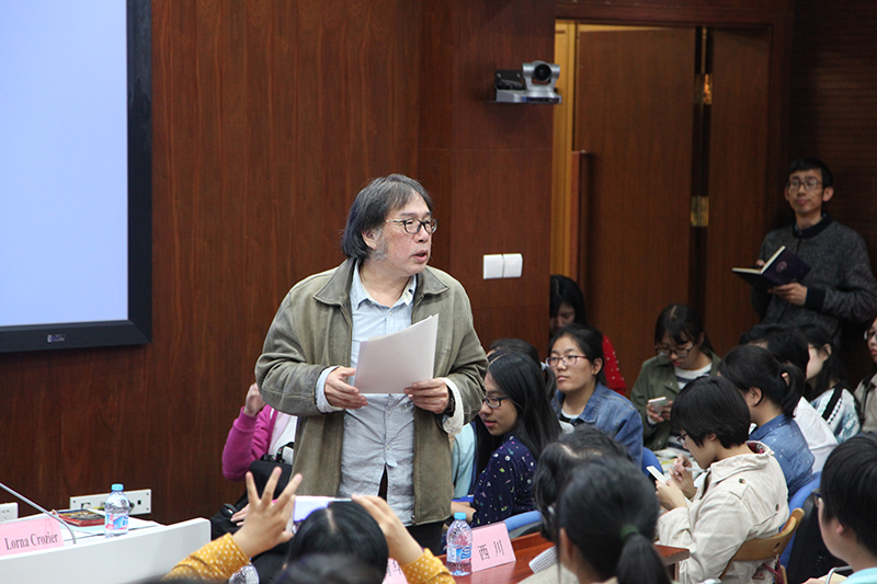 演讲结束后,西川教授作总结。他说,听后让我们有所启发的讲座不在少数,但让我们感动的,却很珍贵。洛娜·克罗齐(Lorna Crozier)以她个人的疼痛感回答了如何面对疼痛的问题,回答了我们应该如何写诗。讲座告一段落,现场观众反响强烈,踊跃提问。探讨的问题涉及诗歌创作、童年痛苦经历对诗歌创作的影响、诗人如何掌控灵感与技巧的关系等各个方面。洛娜·克罗齐(Lorna Crozier)对这些问题依次给予详细解答。