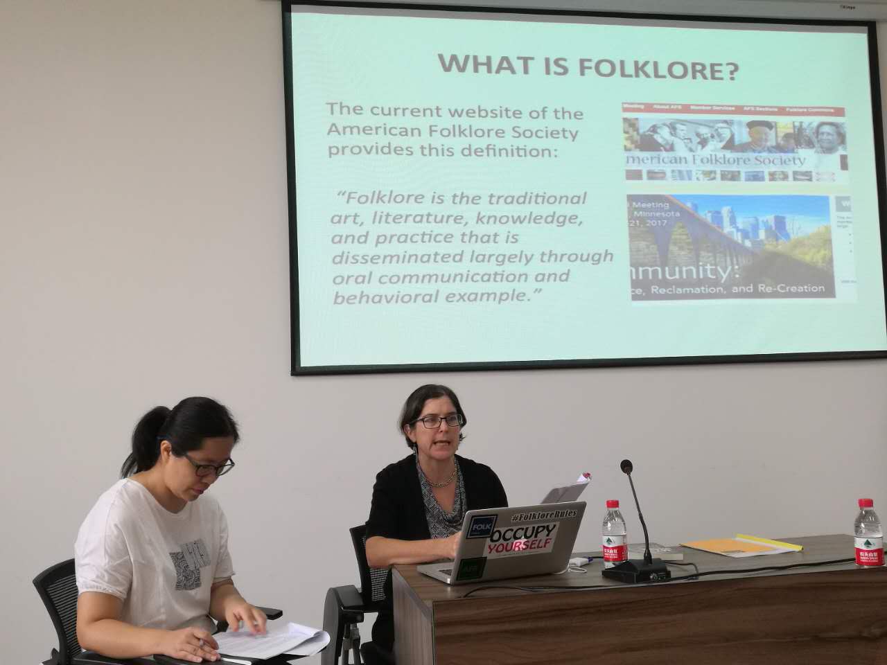 讲座分为上、下午两场,题目分别为:《何谓“民俗”:二十一世纪美国学者的界定》(What is Folklore? Defining Folklore in the 21st Century United States),以及《表演理论与民俗研究》(Performance Theory and Folklore Studies)。Lisa Gilman教授以英文讲授课程,由我所博士研究生张立群与硕士研究生张世萍担任翻译。