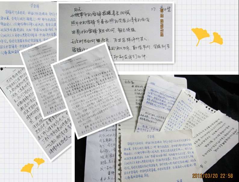 2009级2班团支部发起了“谈新时代雷锋精神”的活动,每位同学写一段雷锋寄语,写出自己心中的雷锋精神:有满怀崇敬的赞扬,有细枝末节的发现,有感悟潜移默化地变化……但是每一段心声的根均在雷锋精神永在上。“爱国,爱人民,也爱时尚文艺,爱创新,也爱写日记,更爱无私奉献,我是平凡的螺丝钉,我和你一样,我就是雷锋。”这简短的几个字便是对与时俱进的雷锋精神的认识。2010级1班团支部开展“学习雷锋精神主题班会”,同学们观看了《离开雷锋的日子》的电影片段,结合近阶段的社会时事,对21世纪的雷锋精神进行了反思。