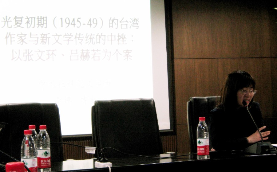 在讲座上,李娜博士首先介绍了台湾光复时期(1945-1949)知识界所发生的变革。随后又以张文环和吕赫若两位台湾作家为个案,勾勒出这一时期的时代氛围,从而展示了在这一特殊转折时期台湾知识分子的个人道路选择和对国家命运与前途的思考。