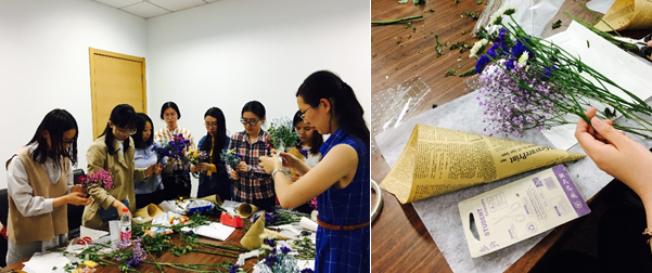 自本活动推出后,大家都热情满满,从宣传推送发出到名额报满仅用了不到两个小时的时间。在筹备过程中,权益部的工作人员也专程到花卉市场精心挑选了各色的满天星,紫蓝色的勿忘我,红黄的玫瑰和纯白的雏菊等多种鲜花以及插花所需要的其他材料,为活动的开展做了充分的准备。