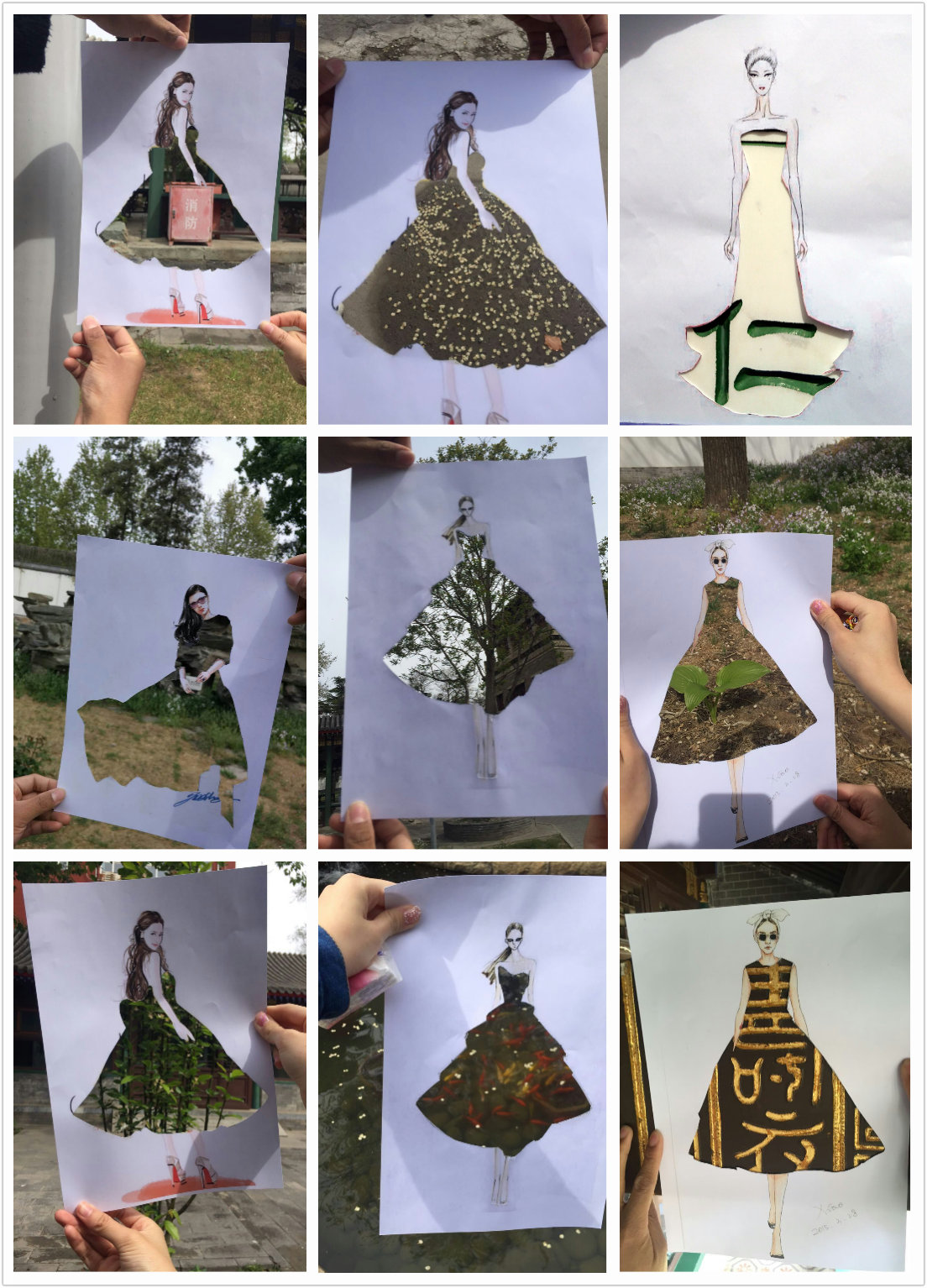 上午九点半左右,同学们抵达辅仁大学。大家利用提前打印出来的镂空时装模特图作为摄影道具,以“春天的衣裳”为主题,把春天的美景装进了模特的衣裙,分组展开创意摄影,完成了许多创意十足的作品。