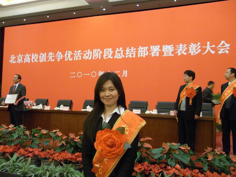 学生十佳共产党员;2010年6月,获第六届“挑战杯”首都大学生创业计划竞赛金奖;2010年4月,获第三届“全国高等院校学生语言文字基本功大赛”一等奖;2010年3月,在中共北京市委教育工作委员会举办的“首都大学生廉洁文化征文活动”中获二等奖;2008年10月,被评为首都教育系统奥运工作优秀学生;2008年9月,被评为首都大学生奥运村(残奥村)住宿服务团队“服务标兵”;2008年10月,被评为首都大学生新世纪英才学校2008级骨干志愿者;2007-2008年度,被评为魔镜街拍