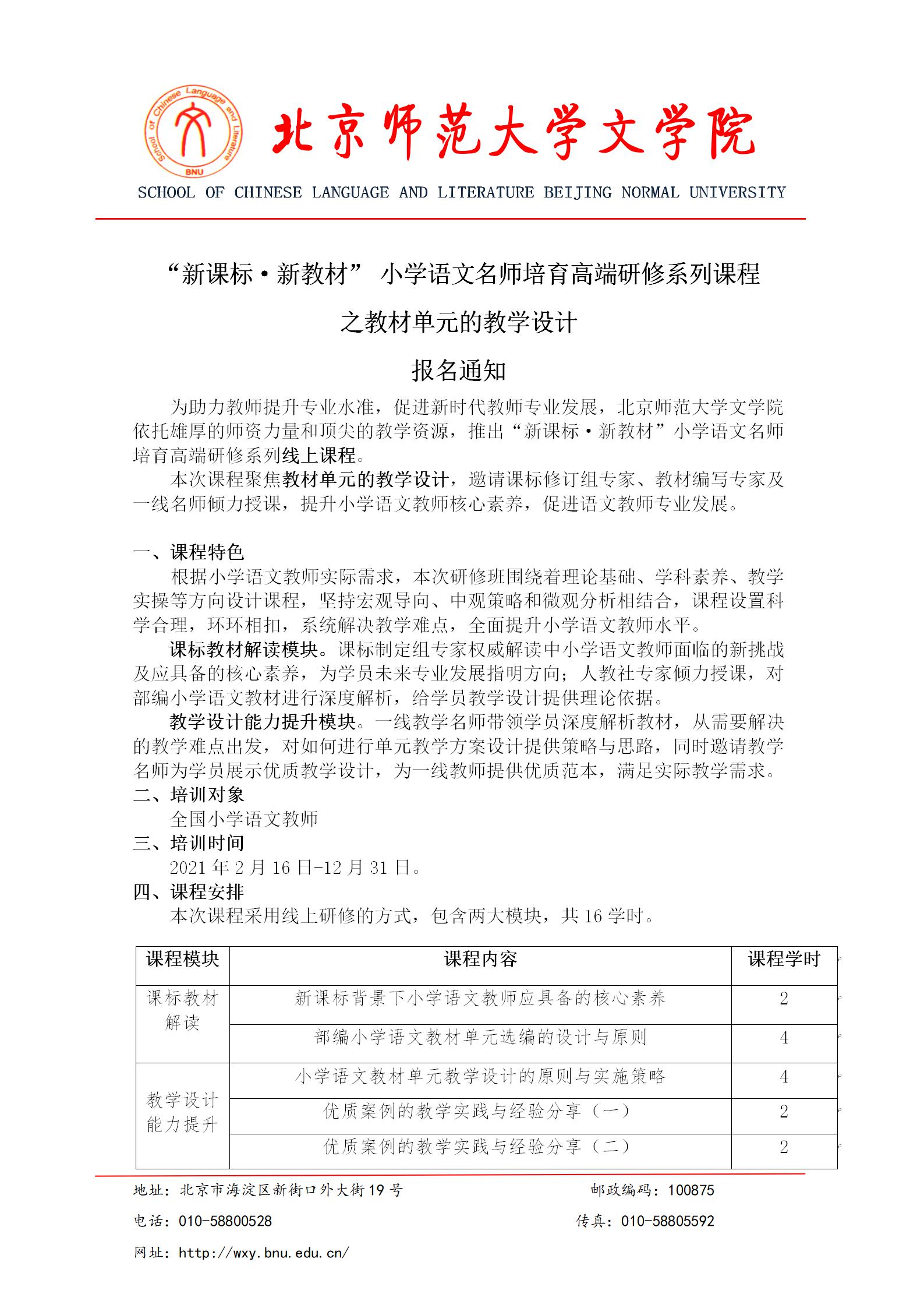 “新课标·新教材” 小学语文名师培育高端研修系列课程 之教材单元的教学设计 报名通知