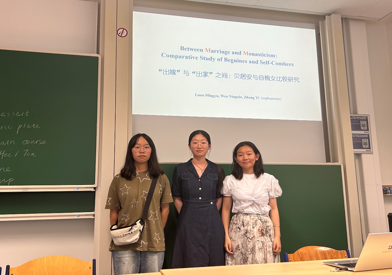 国际课程班采取分组研讨与合作的形式进行交流。同学们以小组为单位,围坐在一起,进行自我介绍和实时互动。最终的课程成果展示方式也采取了小组合作完成并汇报的形式。同学们彼此之间的距离逐渐拉近,本硕博的学制壁垒也被打破,加深了彼此之间的了解,提升了集体协作的意愿和能力。在最后的小组成果展示环节,各组分别围绕中欧音乐艺术节的比较、东西方绘画方式的比较、中欧女性生活方式比较、中法餐饮文化比较、中西“幽默”概念比较、中欧博物馆的比较、比利时的民族国家概念等话题,进行成果汇报,并在老师的指导下,高质量地完成了课程论文。