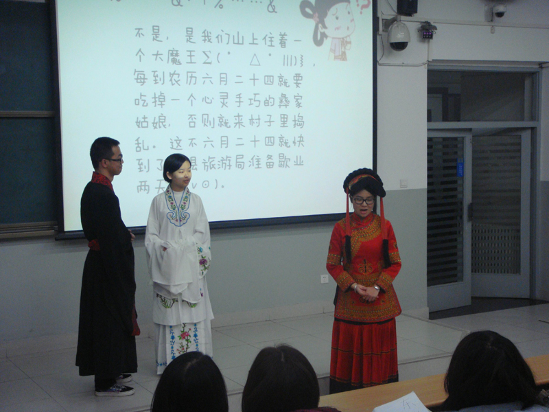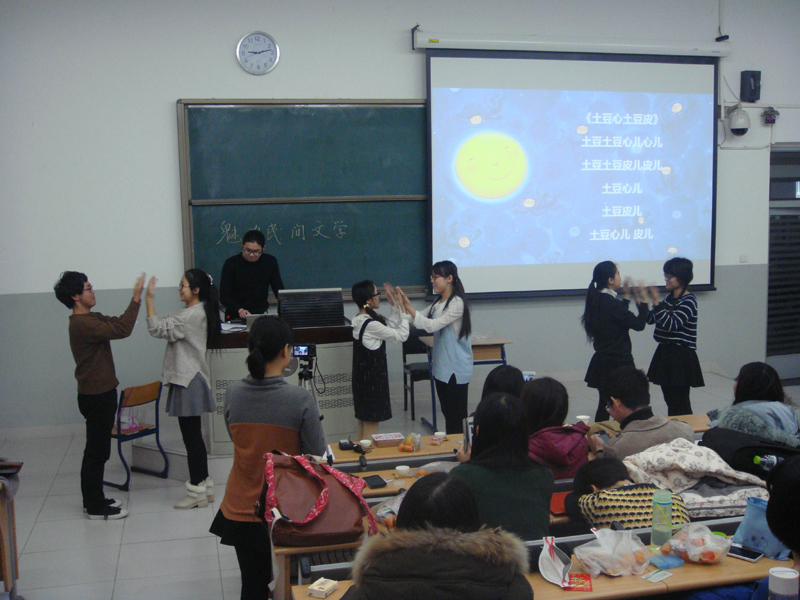 2013级非师范班学生开设的“民间文学概论”课堂上,举行了一场别开生面的“魅力民间文学”表演活动。走进教室,你会看到即将出嫁的客家女子正唱着哭嫁歌与自己的母亲告别;“董永”和“七仙女”成亲后,又热心帮助彝族人民杀死魔王,从此人间开始过起了火把节;大观园中的姐妹们煮茶吟诗,用《二十四节气歌》来歌咏四季;渤海龙王学起了东北话……整个演出气氛热烈,如同一场热闹活泼的联欢会。