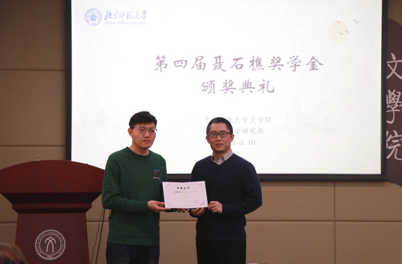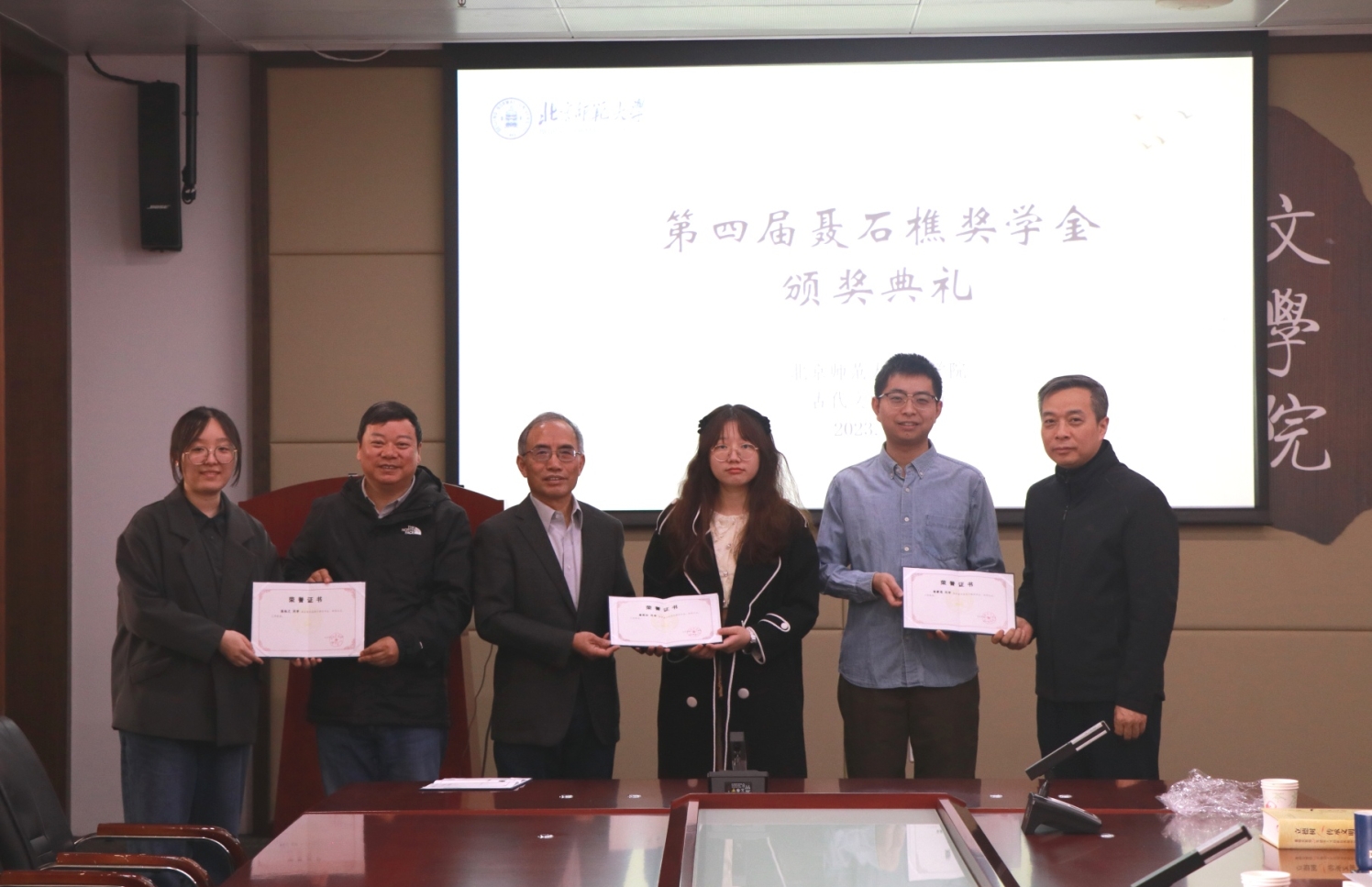 举行。本次典礼对过去一年在古代文学学术研究中取得优异成绩的硕、博研究生进行颁奖和表彰。出席颁奖仪式的有聂石樵奖学金执行人、现代汉语研究所聂大昕老师,古代文学研究所郭英德、过常宝、康震、张德建、李小龙、周剑之、刘全志、谢琰、颜子楠、诸雨辰、吴沂澐、余丹等老师。古代文学研究所的二十余位硕士、博士研究生参加了颁奖仪式。