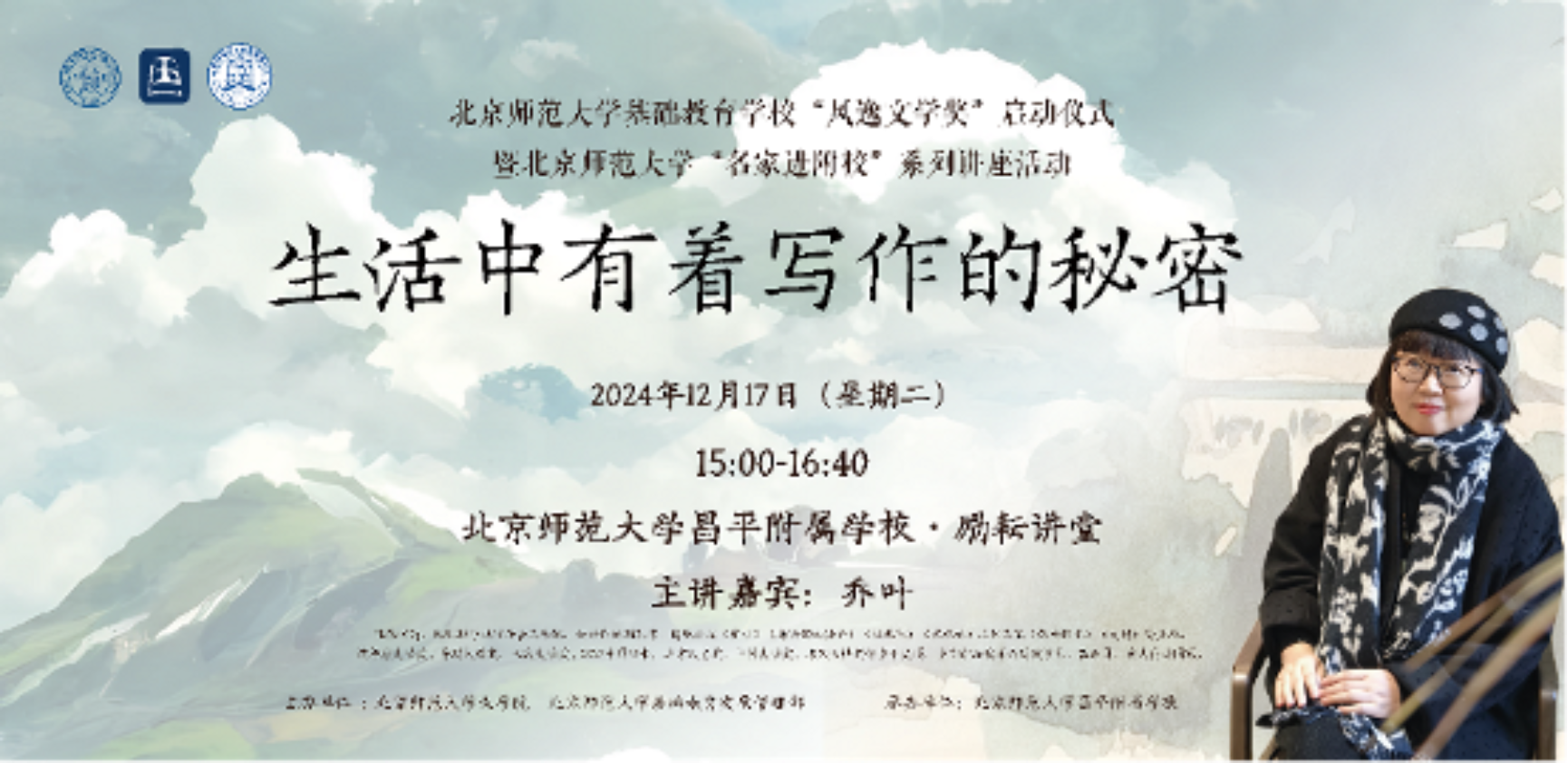 基础教育发展管理部,特别邀请北京市作家协会副主席、茅盾文学奖获奖作家乔叶走进学校,带来专题讲座《生活中有着写作的秘密》,引领同学们在生活中真诚体悟、敏锐觉察,在感知中成长,进而涵养灵感,向写作进发。