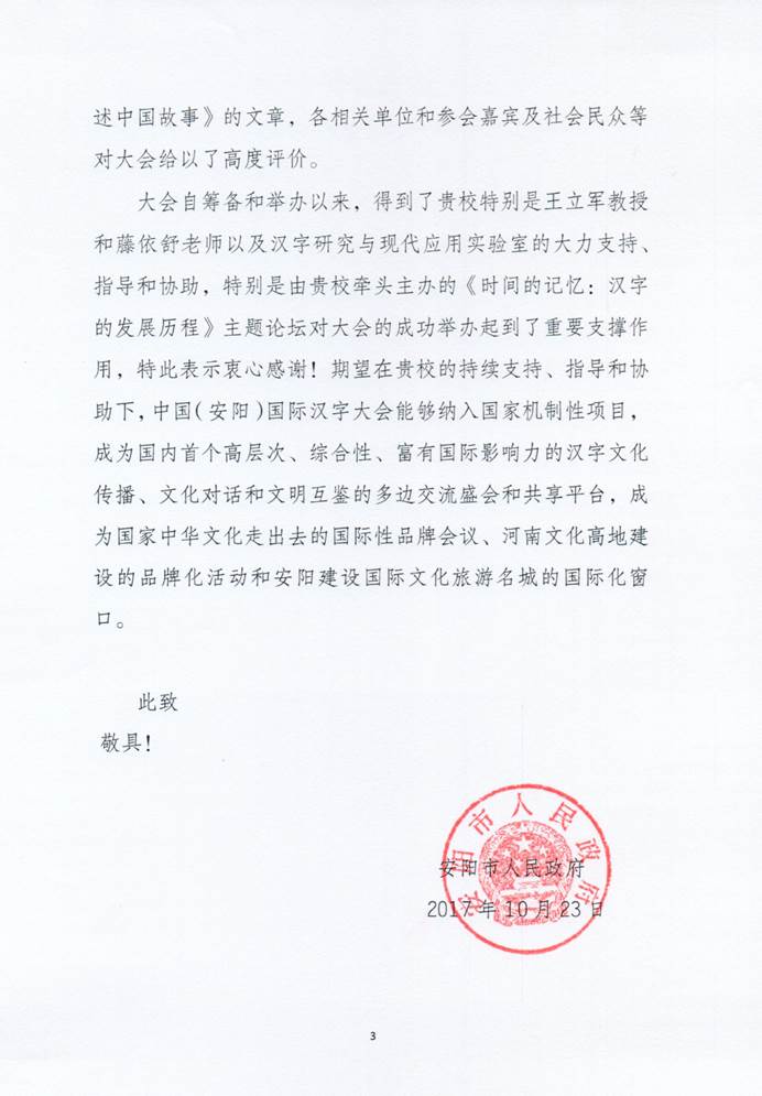汉字研究与现代应用实验室牵头主办的《时间的记忆:汉字的发展历程》主题论坛,认为该论坛对大会的成功举办起到了重要的支撑作用,并期望能够在我校的持续支持、指导和协助下,中国(安阳)国际汉字大会能够纳入国家机制性项目,成为国内首个高层次、综合性、富有国际影响力的汉字文化传播、文化对话及文明互鉴的多边交流盛会和共享平台,成为国家中华文化走出去的重要国际性品牌。