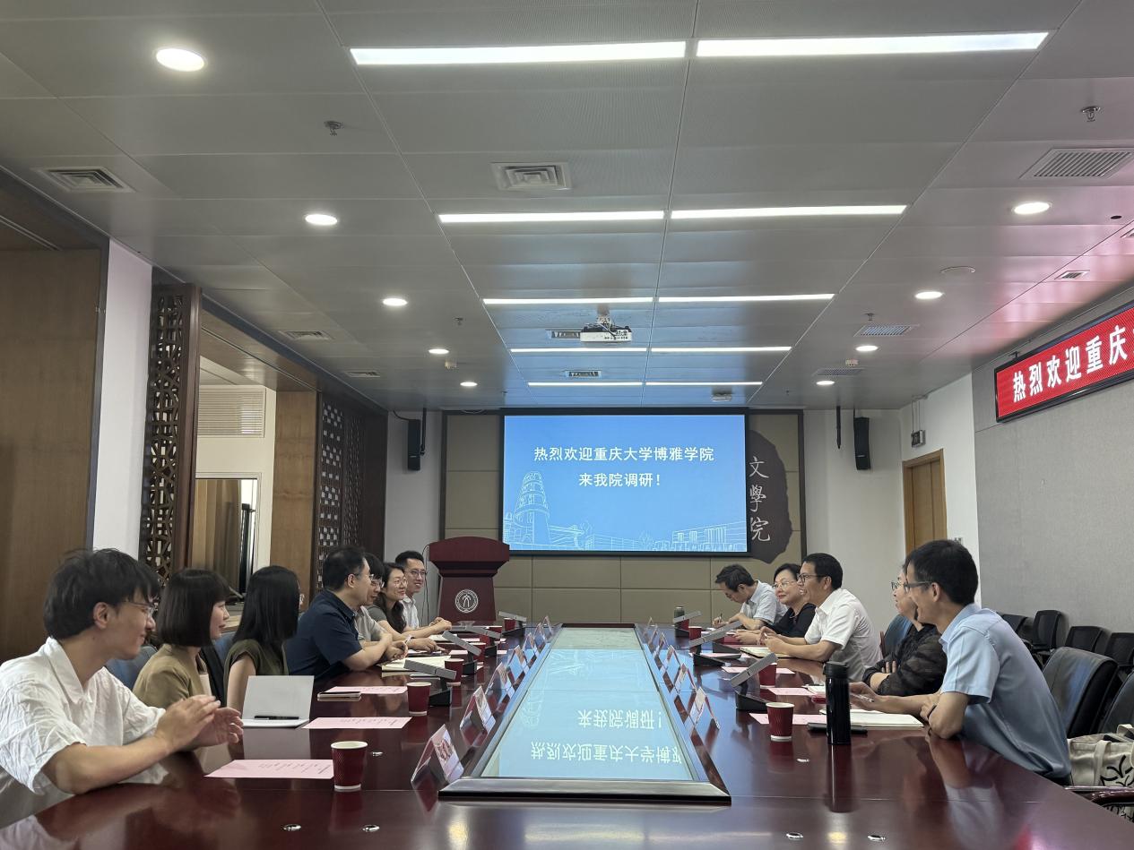 2025年6月5日上午,重庆大学博雅学院副院长(代院长)李广益、中文系主任金浪、支部书记万曼璐、中文系副主任肖馨瑶、科研秘书罗宇、中文系学科秘书张振、崔文骏一行7人前来魔镜街拍 调研。交流会由书记周云磊主持。