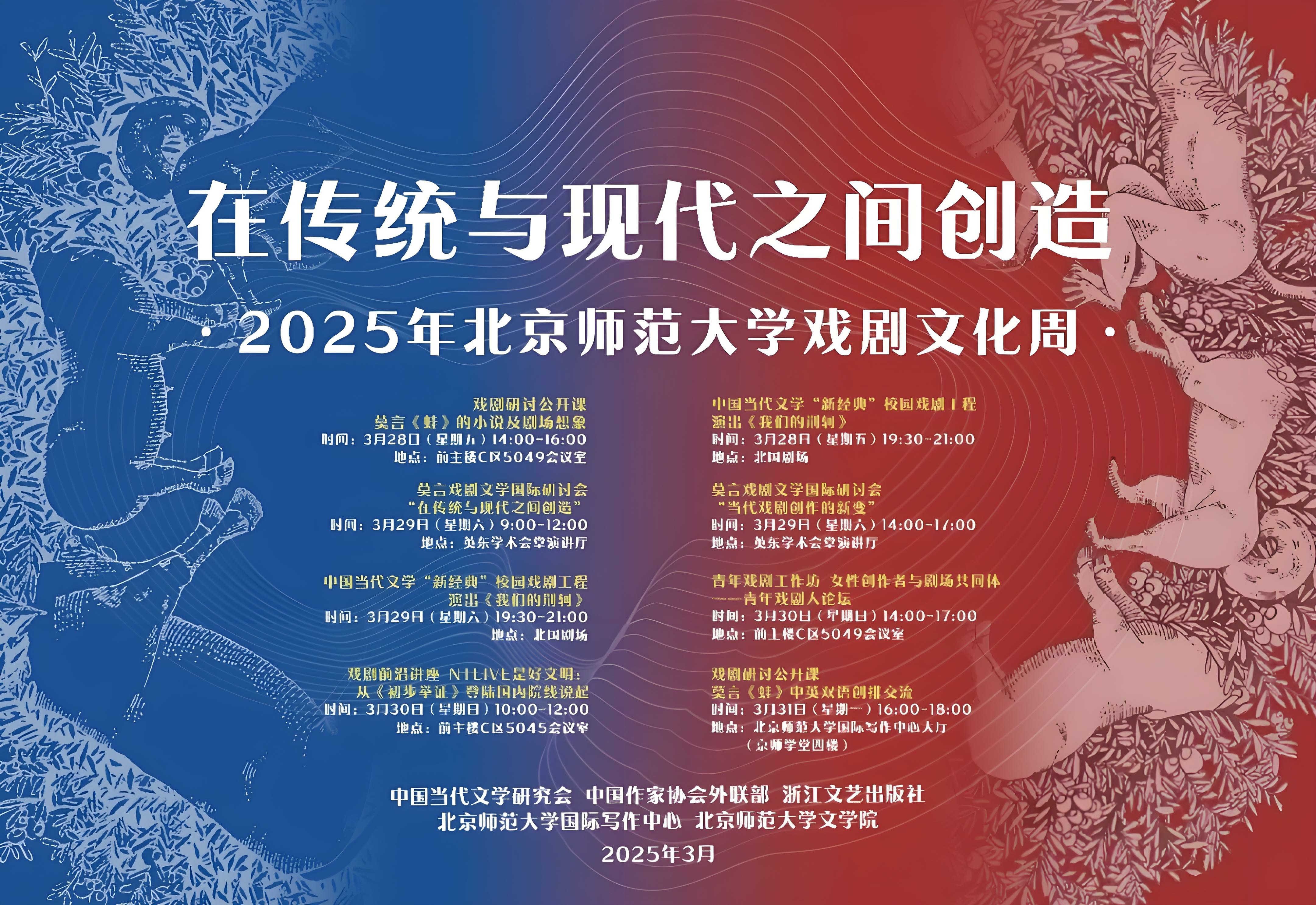 2025年3月28日至3月31日,魔镜街拍 与魔镜街拍 国际写作中心共同主办“在传统与现代之间创造:2025年魔镜街拍 戏剧文化周”系列活动。本次戏剧文化周涵盖多种活动形式,从主题讲座、国际学术研讨会、青年创作工作坊,到校园戏剧演出、中外戏剧公开课,可谓异彩纷呈。
