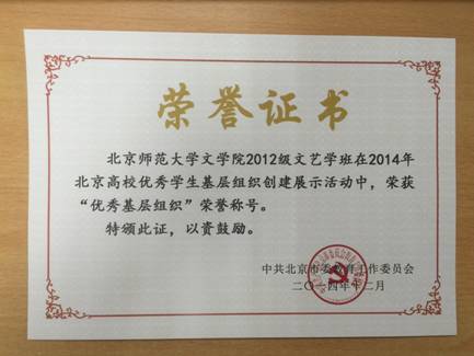 2011级汉语言文学一班荣获“示范班集体”荣誉称号,2012级文艺学班荣获“优秀基层组织”荣誉称号。