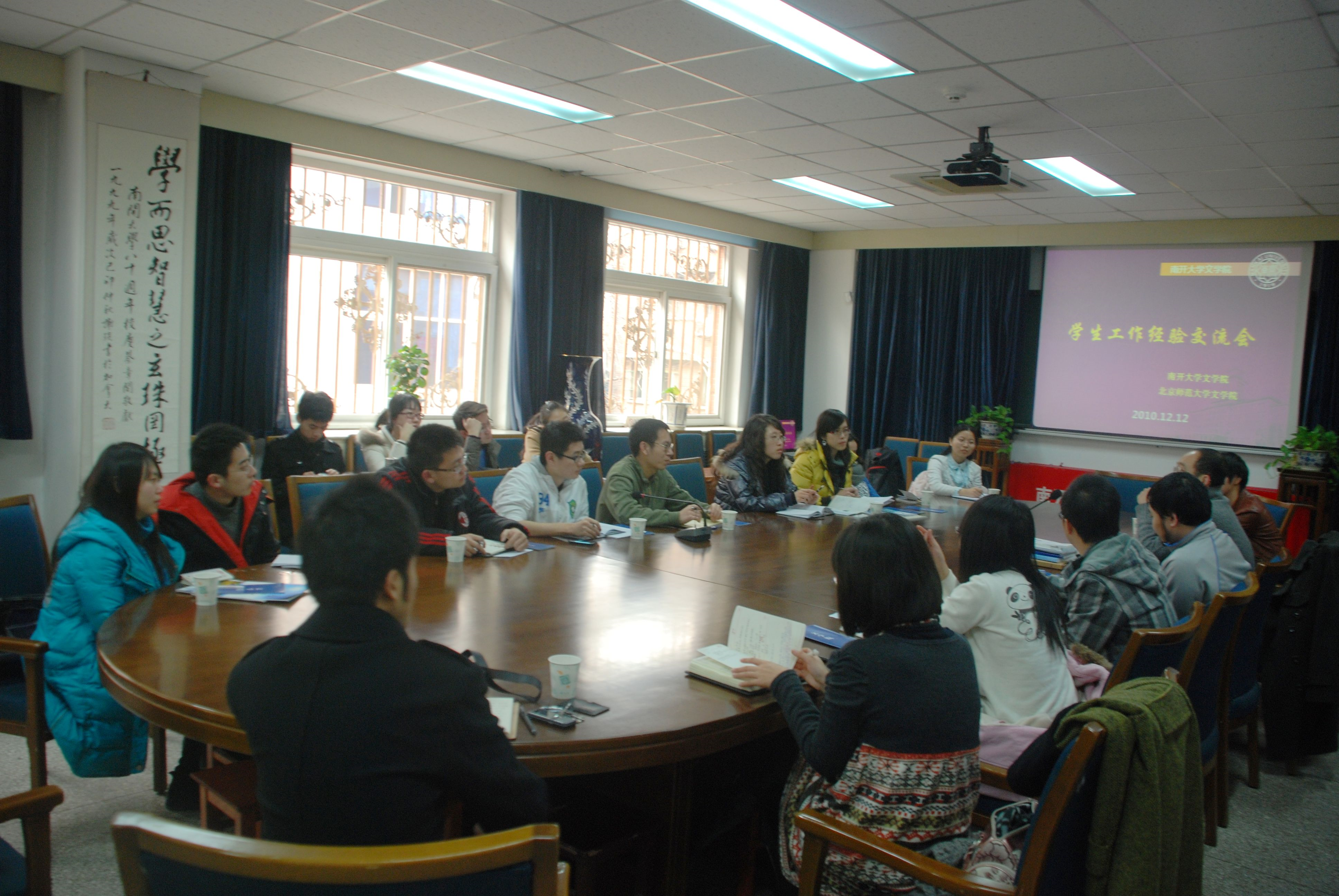 一行来到天津大学文法学院,文法学院党委副书记张秀娟老师、分团委书记王用源老师出席并介绍了学院的研究生工作概括和特色。天津大学文法学院由中文、法学、英语三个专业组成,研究生人数相对较少。两院就研究生学术活动、班级活动的组织开展等问题进行了讨论和交流。