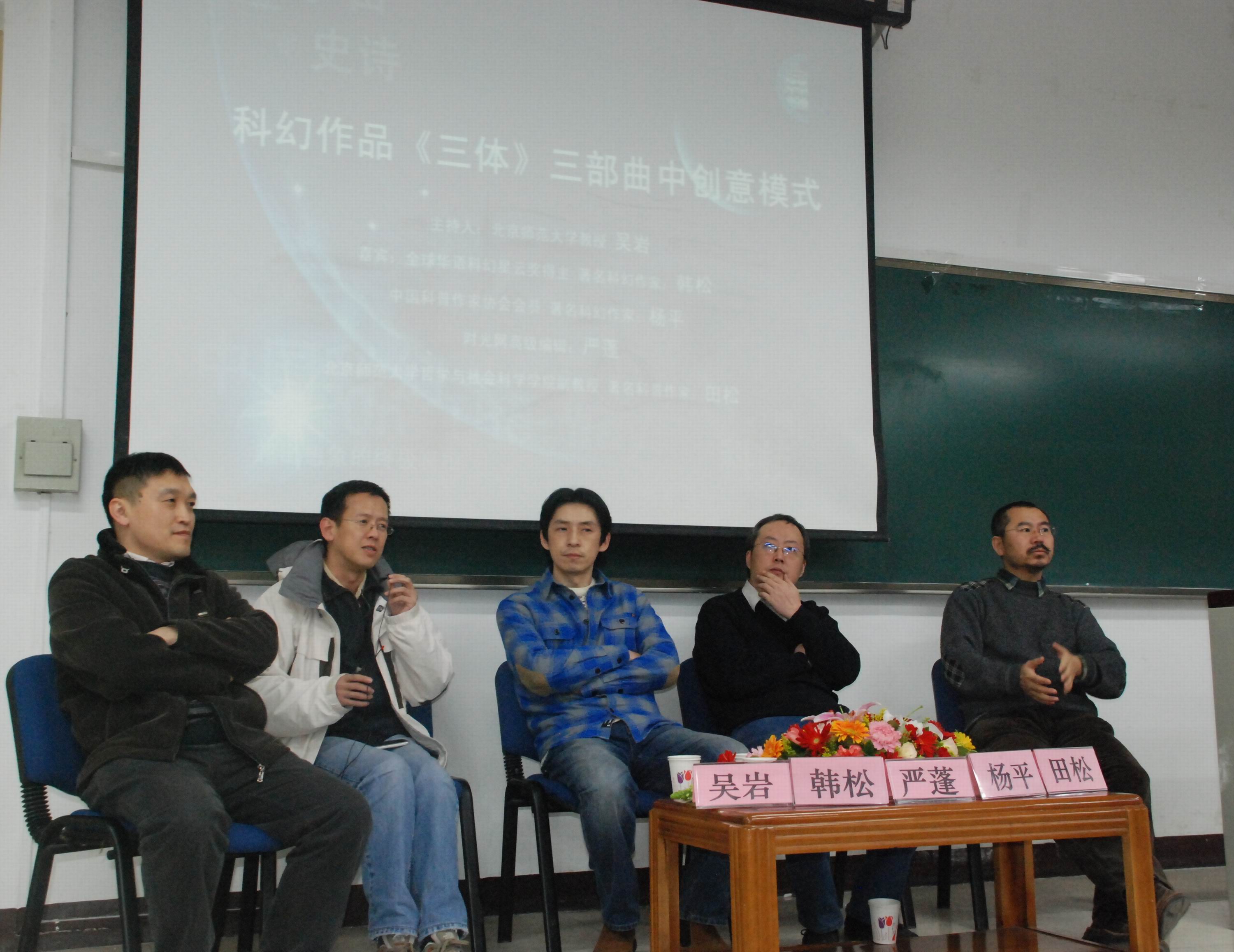 教二101教室举行。到场的嘉宾有著名科幻作家韩松、杨平,时光网高级编辑、著名影评人严蓬,北师大哲学与社会学学院副教授田松等人。在北师大教育学部教授、科幻研究者吴岩老师的主持下,与会嘉宾妙语连珠,各自从不同的视角提出了自己的精辟见解。
