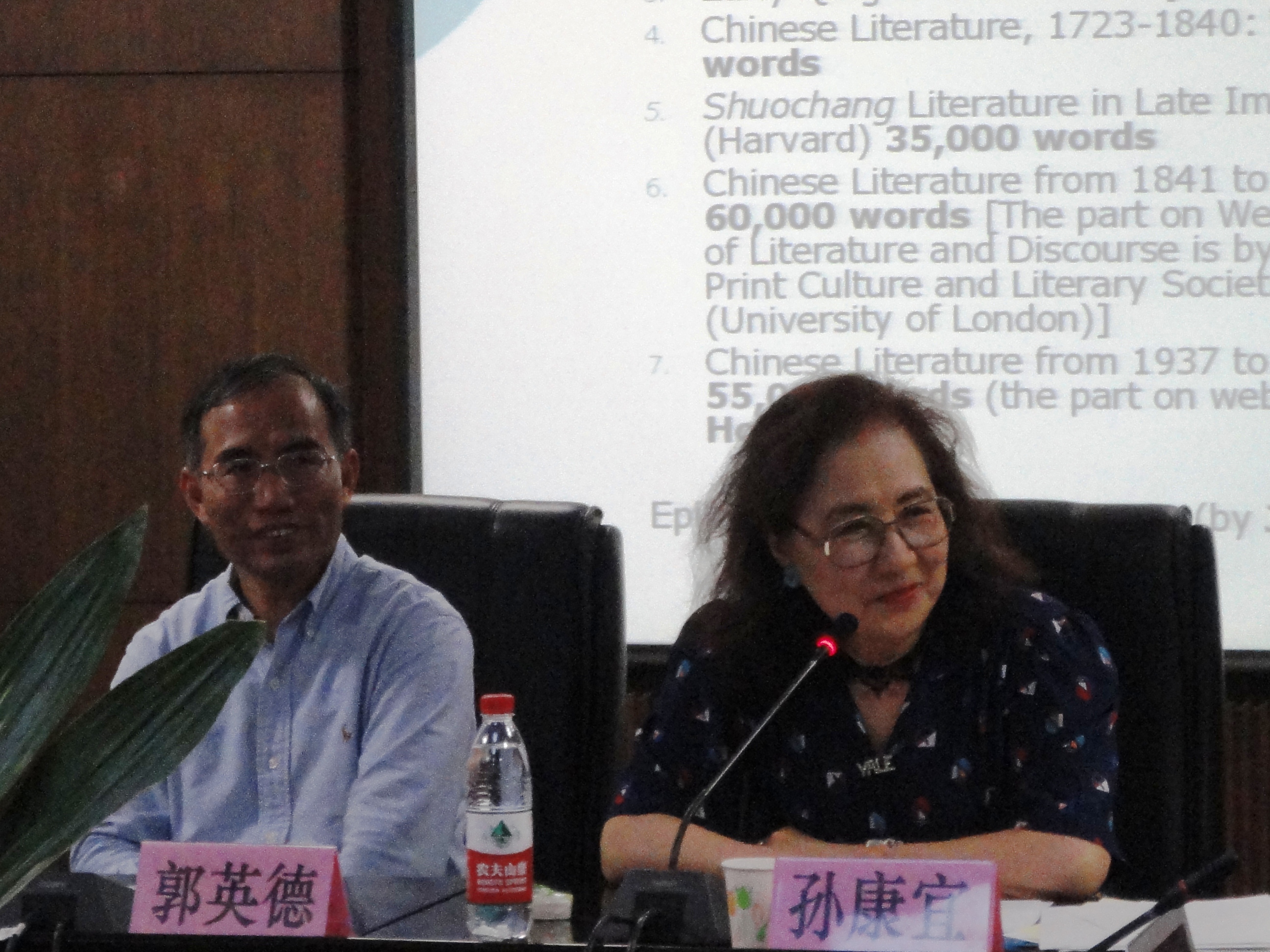随后,孙教授详细介绍了《剑桥中国文学史》的编纂人员和编纂过程。本套图书由孙康宜教授和美国汉学界的顶尖人物宇文所安共同主编,众多知名汉学家合作编写。在合作过程中,每个专家分写一段历史,科学分工,各取所长。