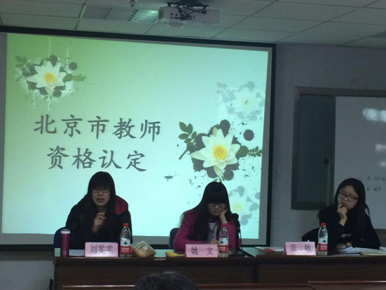 接下来是刘雯雯同学结合自身实际,为大家讲解了北京市教师资格认定的相关内容,并对大家普遍反映较为困难的面试环节给予细心指导。