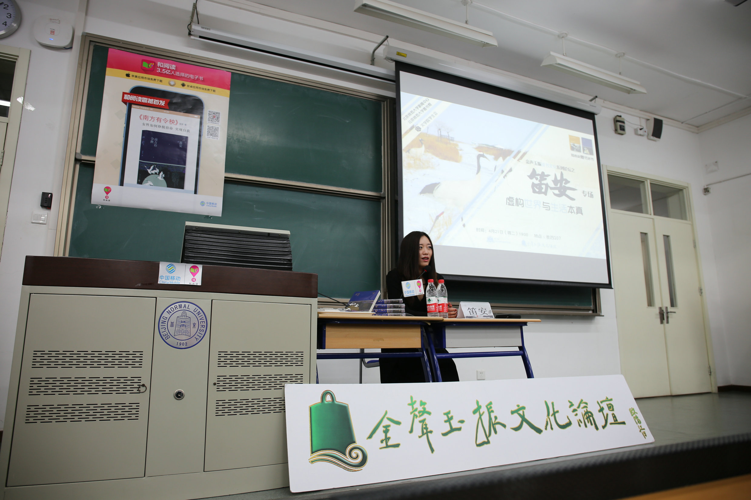 学生会、鹭江出版社主办的第八届北京市大学生读书文化节、金声玉振读书文化系列论坛之“虚构世界与生活本真——笛安专场”在北师大教四楼107教室举行。著名作家、《文艺风赏》杂志主编笛安与观众分享了自己创作背后的故事和感悟,全场气氛热烈。