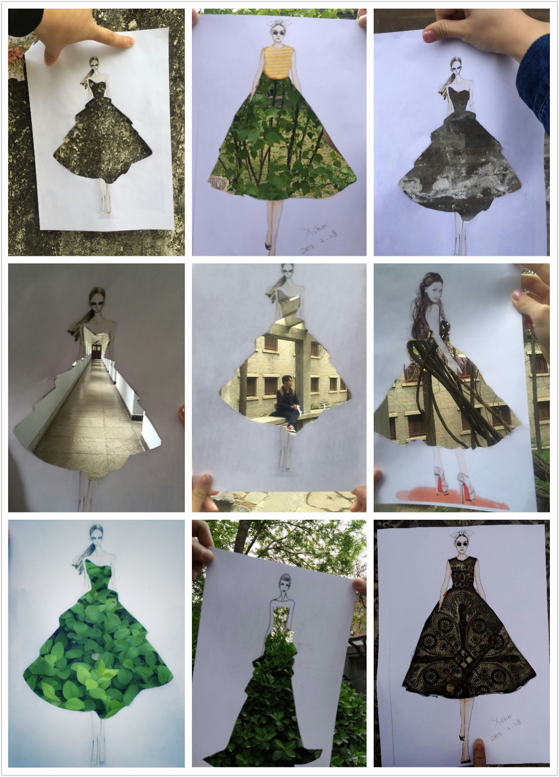 上午九点半左右,同学们抵达辅仁大学。大家利用提前打印出来的镂空时装模特图作为摄影道具,以“春天的衣裳”为主题,把春天的美景装进了模特的衣裙,分组展开创意摄影,完成了许多创意十足的作品。