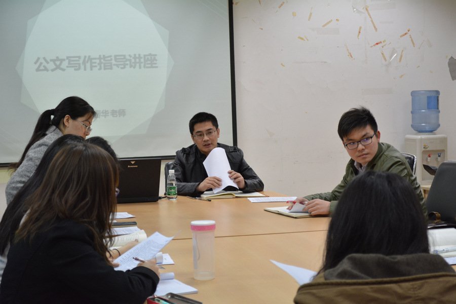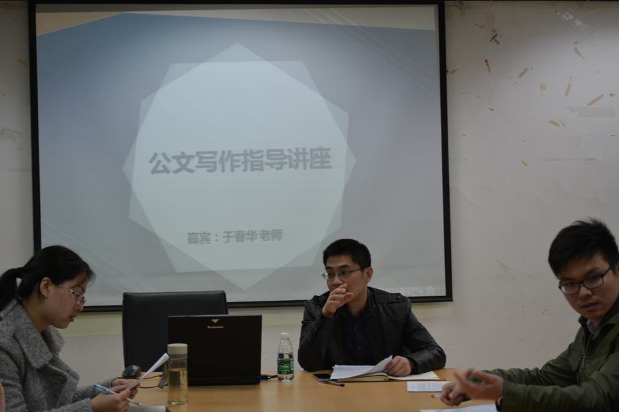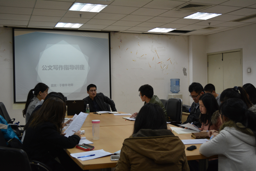 在一个多小时的讲座中,于春华老师结合自身工作经验,就公文写作的要领做了深入浅出的讲解,建议大家从“形”与“神”两方面落实公文写作,强调行文的逻辑性与思想性并重,力图使文章形神兼备,体貌俱全。为此,于老师要求大家多读多写,读可以积累写作素材,写方能切实提升写作能力。只有深入学习领会,扎实培育践行,将学习实践核心价值观、关注时政评论与公文写作紧密结合,才能立意高远,视野开阔,言之有物;只有提升学习能力,敢于创新进取,才能推进自我完善、自我革新与自我提高;只有端正写作态度,求真务实,才能尊重历史、立足当下、面向未来。